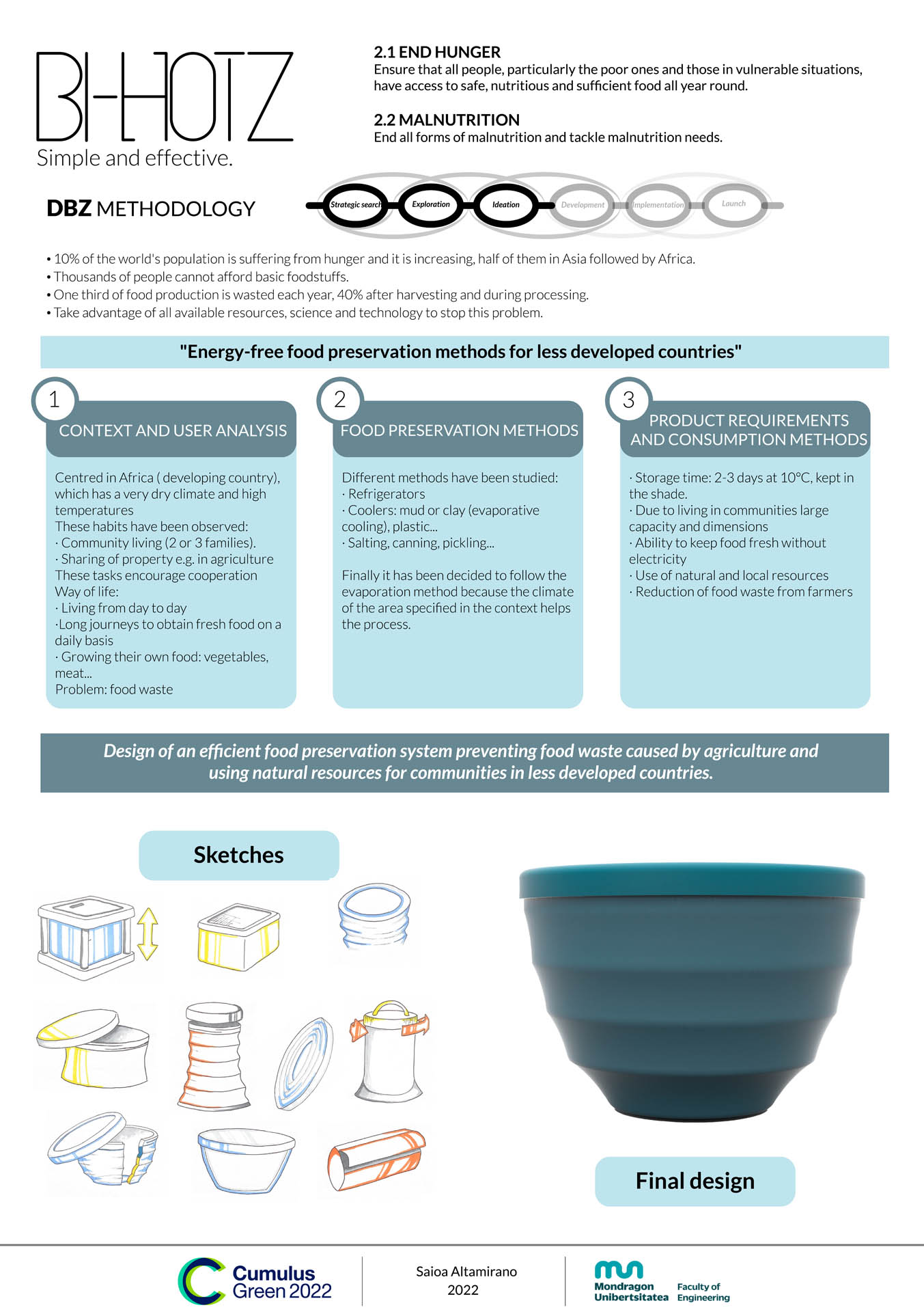 After that, several product requirements were set such as the minimum storage time (2 to 3 days), general dimensions, use of natural and local resources without electricity or reduction of food waste from farmers. All these statements helped to define a Brief: “Design of an efficient food preservation system preventing food waste caused by agriculture and using natural resources for communities in less developed countries”.