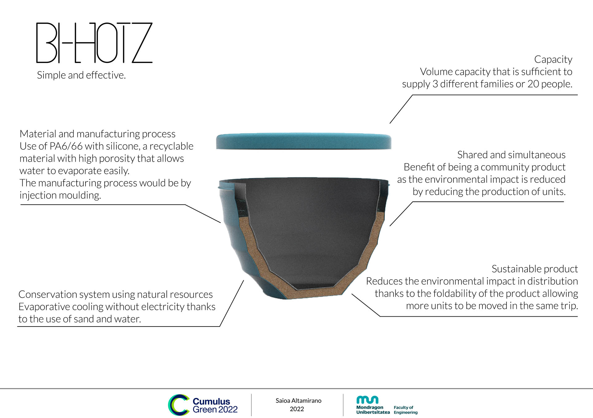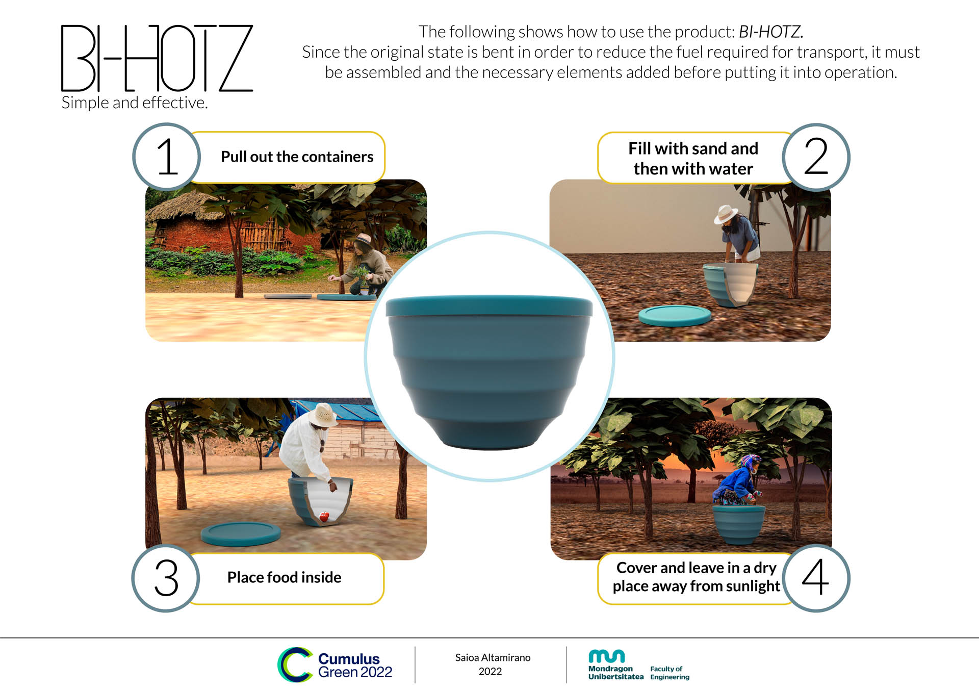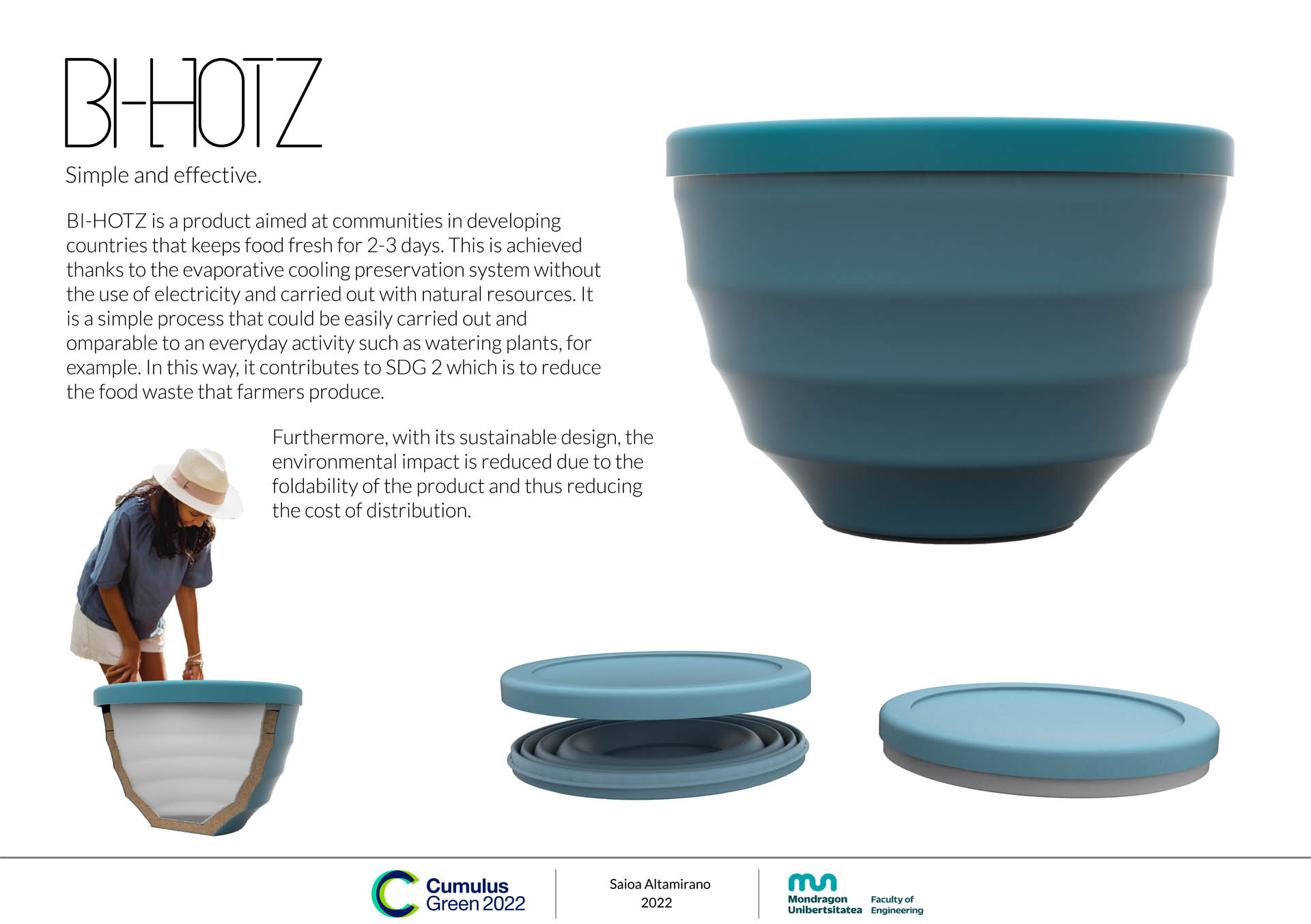 BI-HOTZ is a product aimed at communities in developing countries that keeps food fresh for 2-3 days. This is achieved thanks to the evaporative cooling preservation system without the use of electricity and carried out with natural resources. It is a simple process that could be easily carried out and comparable to an everyday activity such as watering plants, for example. In this way, it contributes to SDG 2 which is to reduce the food waste that farmers produce.