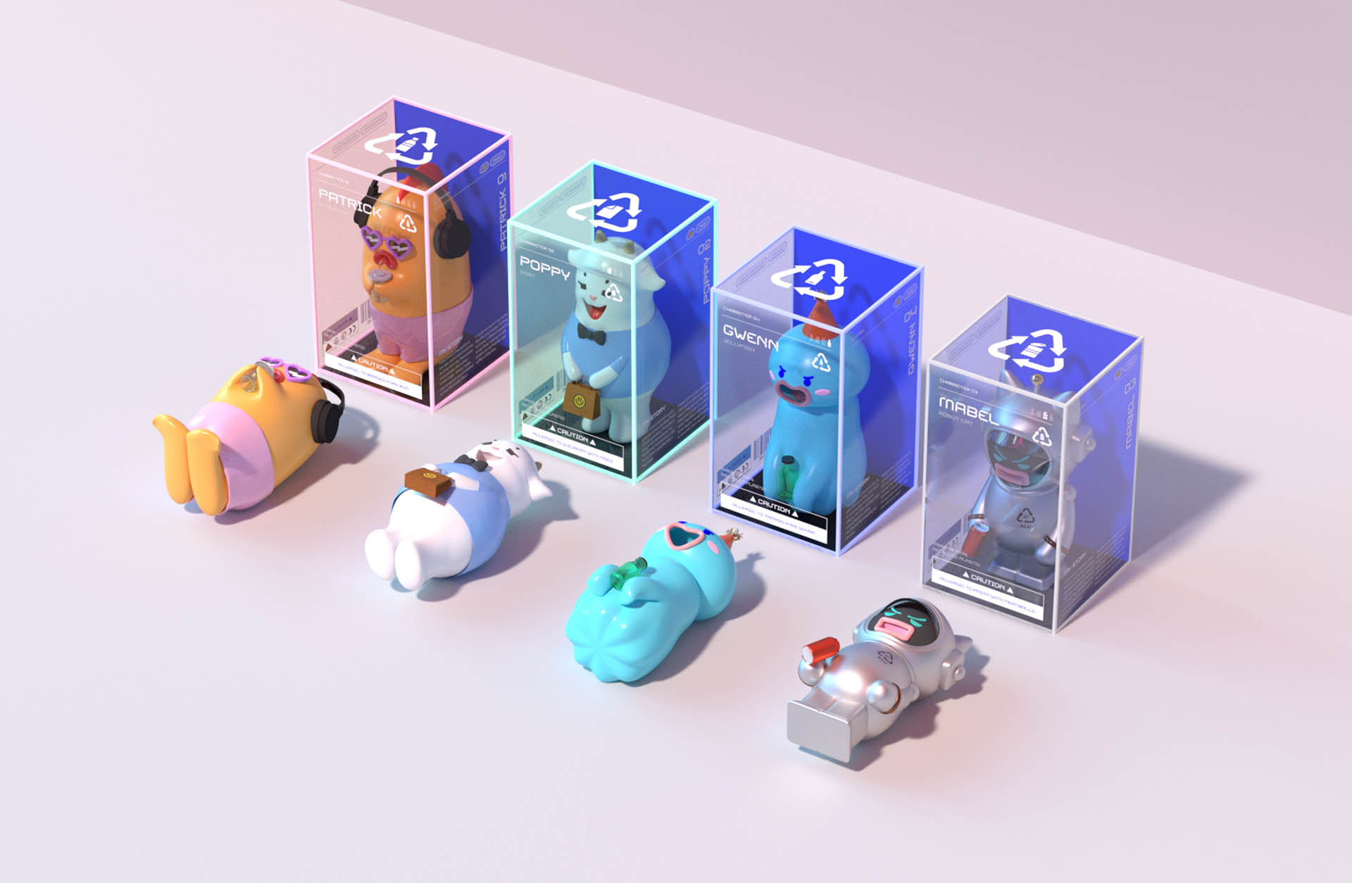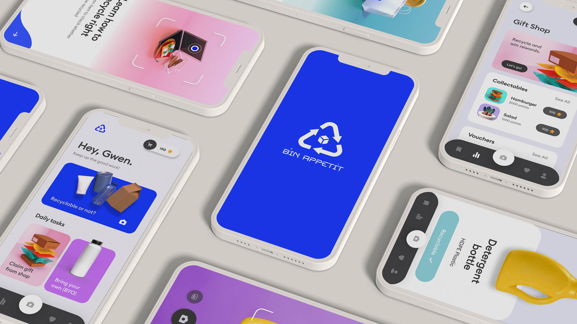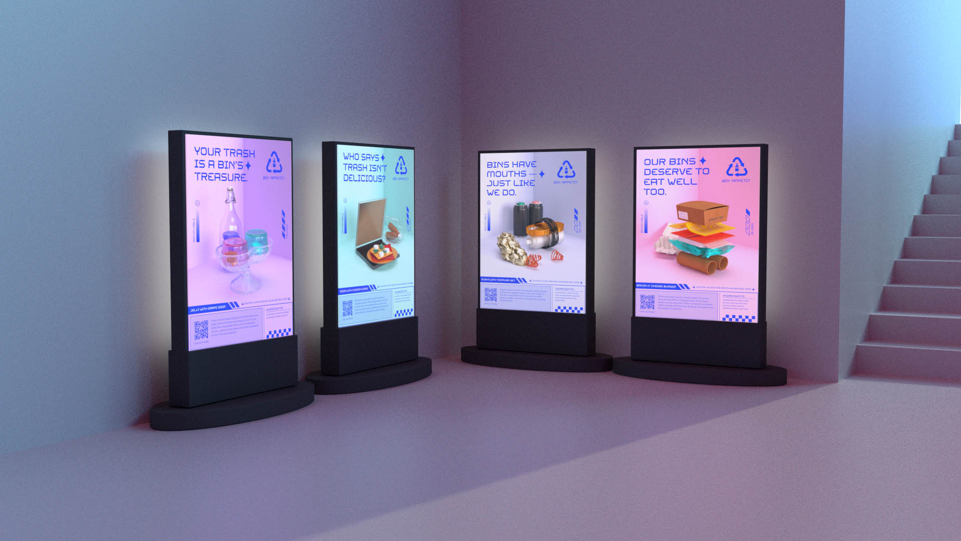 Bin Appetit is an educational recycling campaign hoping to provide an unconventional learning experience by representing recyclables as food for recycling bins. Through a seggregated recycling system (plastic, paper, metal and glass), each category will be represented by a character: Plastic Pebbles, Paper Poppy, Metal Mabel and Glass Gwenn. This provides children with a fun educational experience by finding out what items they can ‘feed’ each recycling bin, by representing recyclables that can be thrown into the recycling bin as a food dish that the bin enjoys eating.