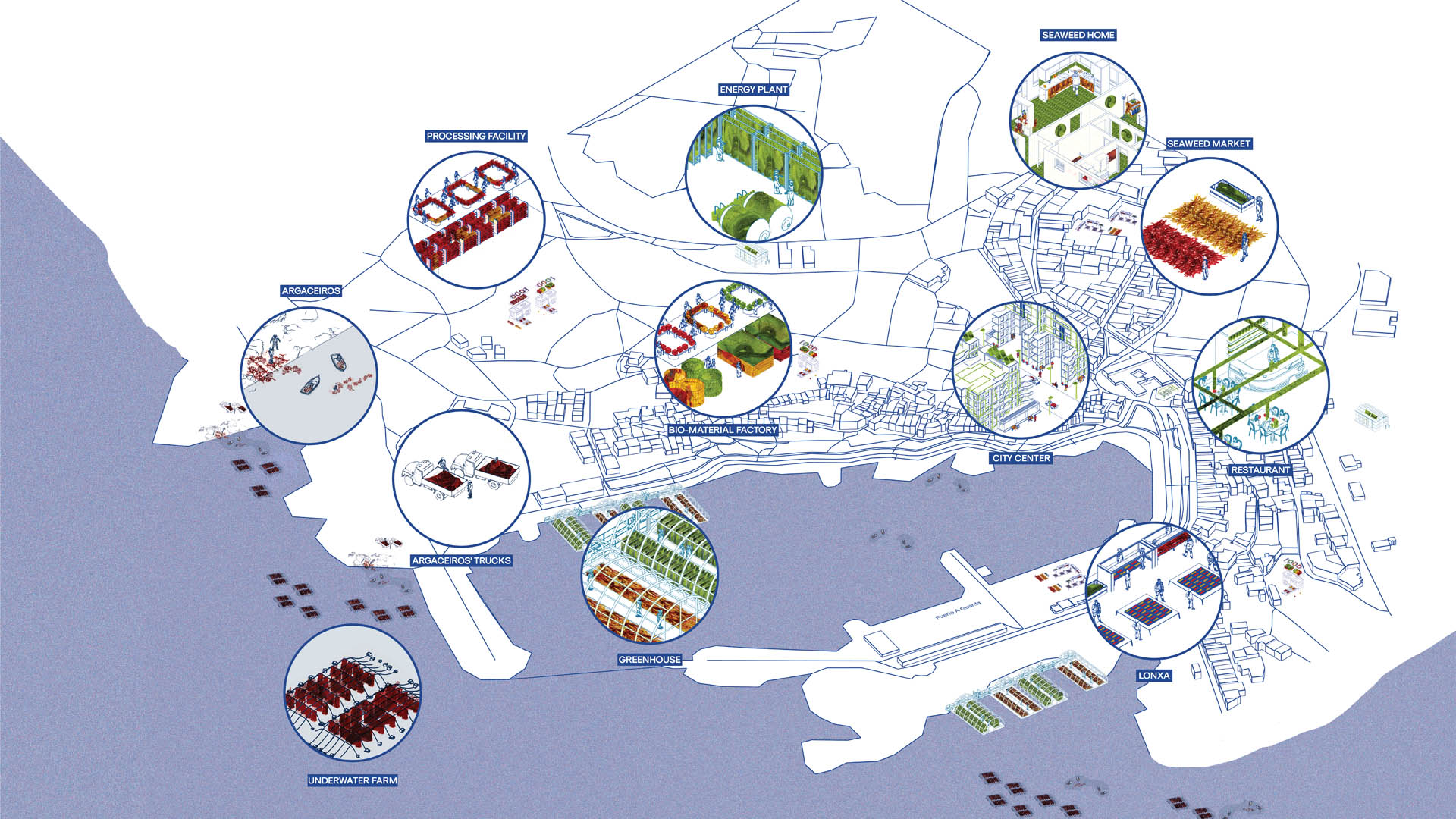 Edible Sea-scapes explores the abusive relationship between humans and the ocean, and explored the opportunities that can emerge from looking at past practices for sustainable solutions. It takes the small coastal town of A Guarda, Galicia, as the place to develop a seaweed-based agricultural system. The town was chosen since it is one of the few remaining seaweed harvesting towns in Spain. The project itself proposes a system implemented in three phases into the town to substitute fishing and build more sustainable economies from seaweed farming. Variations of this system can be applied into any coastal town in the world by adapting the seaweed species and the activities of implementation.