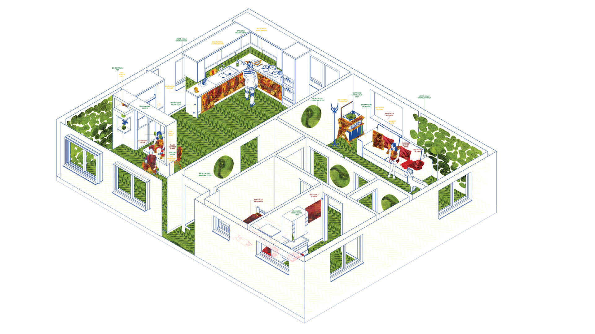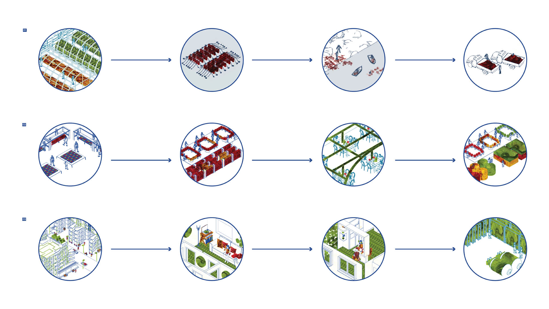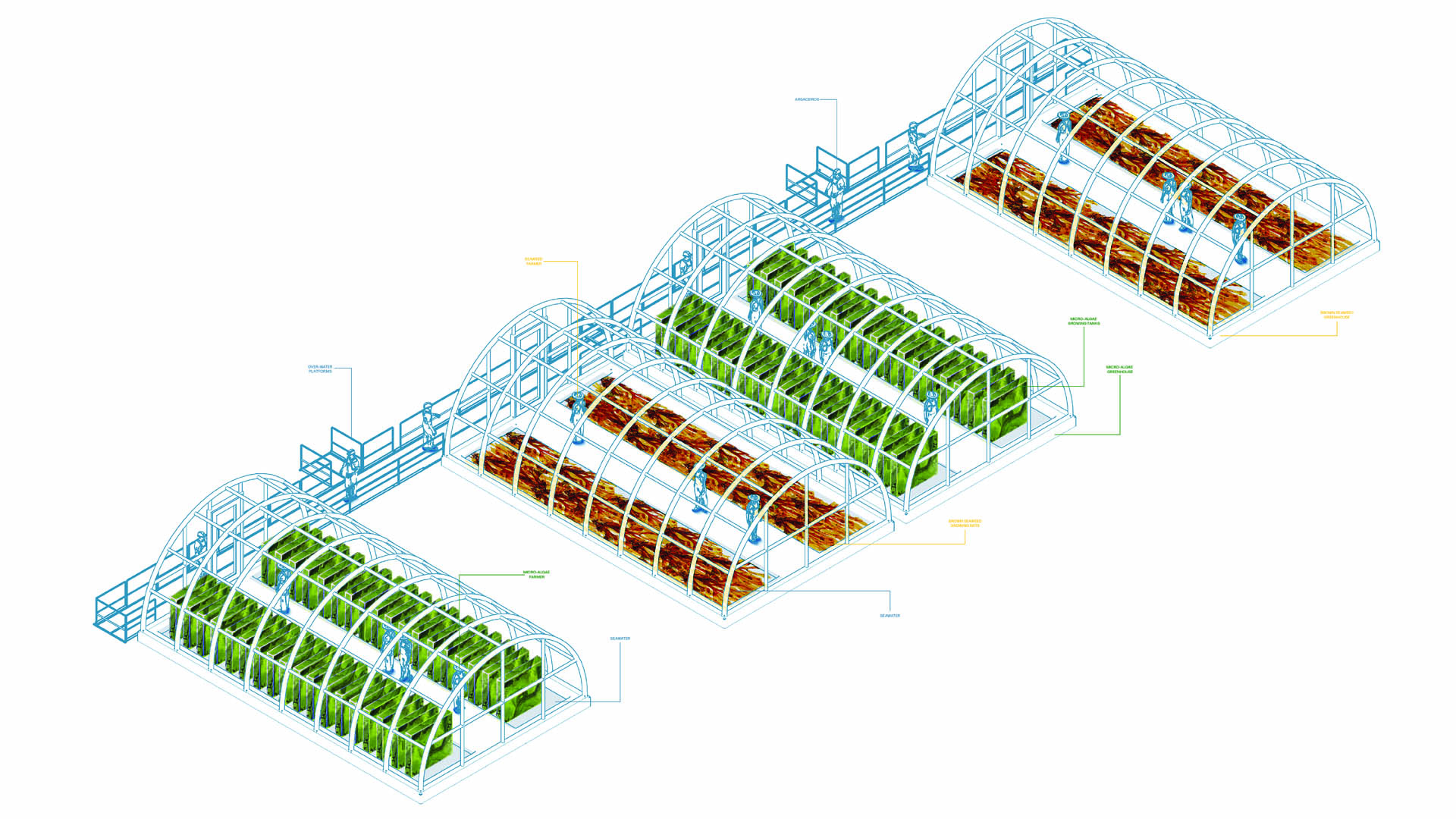 Algae is a versatile element of our ecosystems. When farmed, it helps keep oceans healthy and clean. Its uses are growing more and more everyday, but some examples of its applications are in food, energy, fertilizers, bioplastics, and clothing, just to name a few. Several towns in Galicia have a history of using seaweed and seaweed is embedded into the oceanic culture. This project takes seaweed farming to an extreme. The project aim is a scalable agro-ecologic farming system based on three different types of algae: red and brown (macro algae) and blue-green micro algae. The system will be represented in the main seaweed-harvesting town of Galicia which is A Guarda; but it could be applied to any other town in different scales and by changing the algae used. The project deliverable is a set of axonometric drawings representing the system broken down and explained.