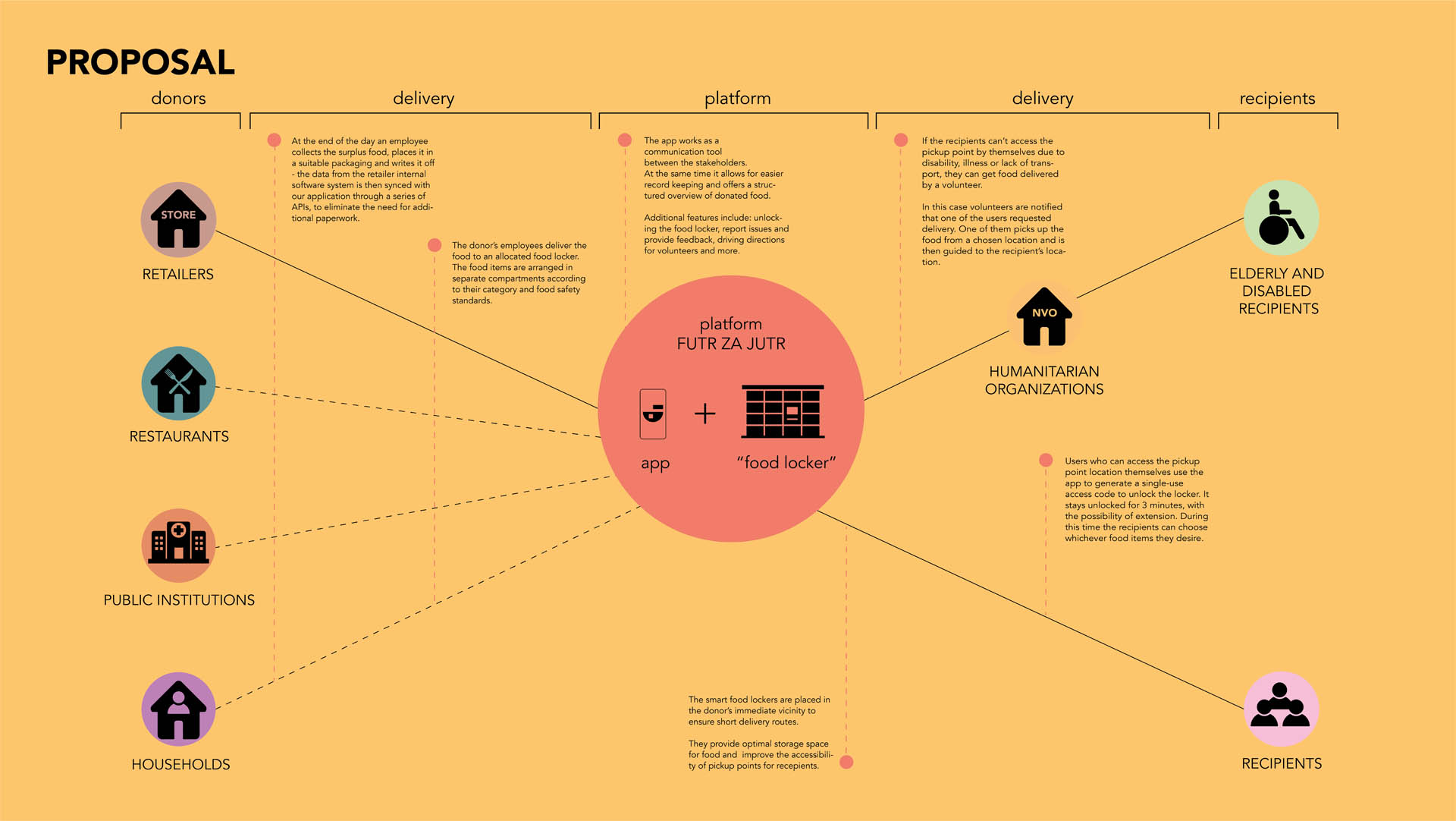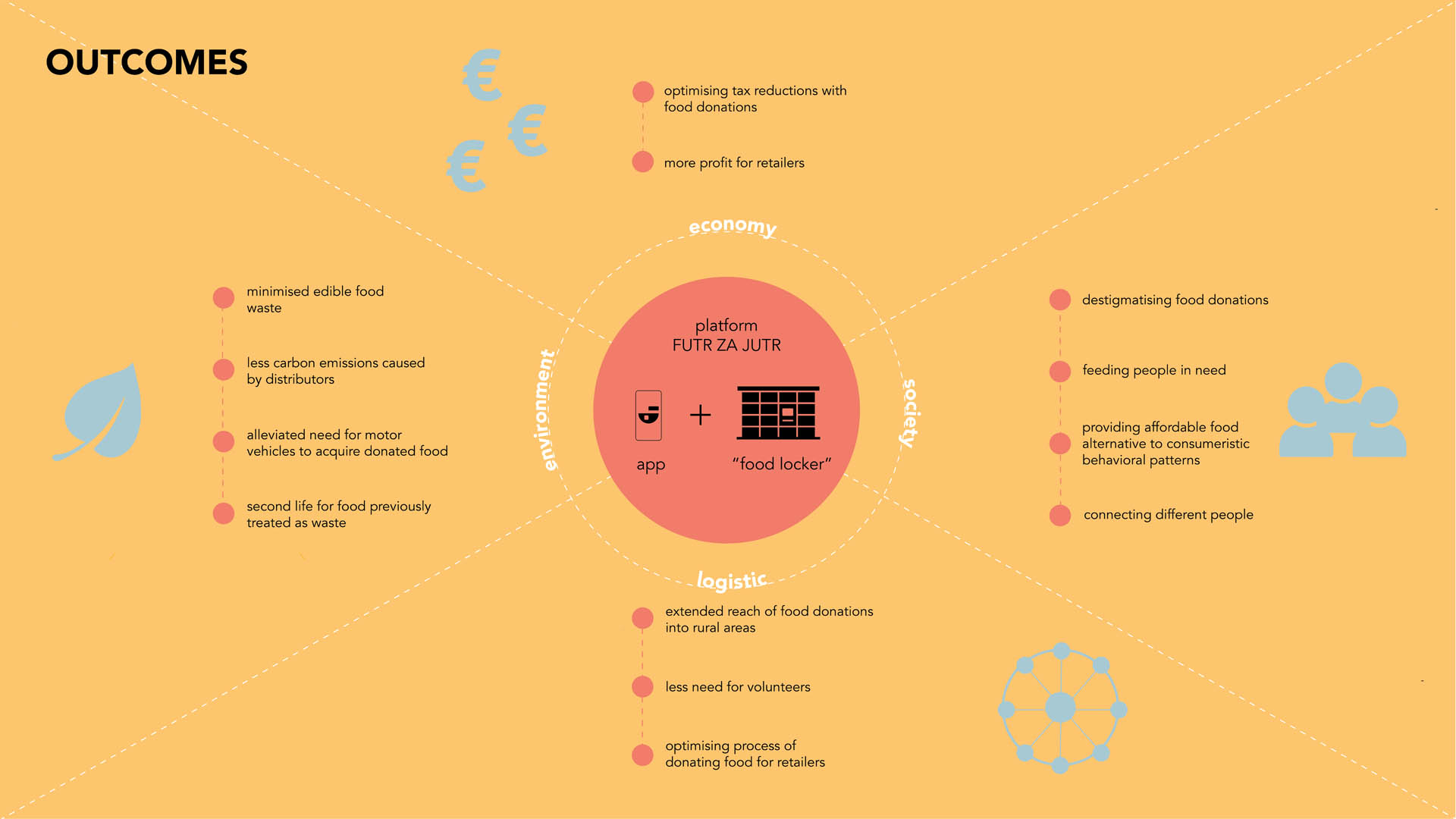 “FUTR za JUTR” combines an app and a smart food locker in order to decrease the amount of food waste by improving food donations. The app works as a communication tool between stakeholders, while food lockers improve the accessibility of pickup points for users and lessen the work burden for volunteers.