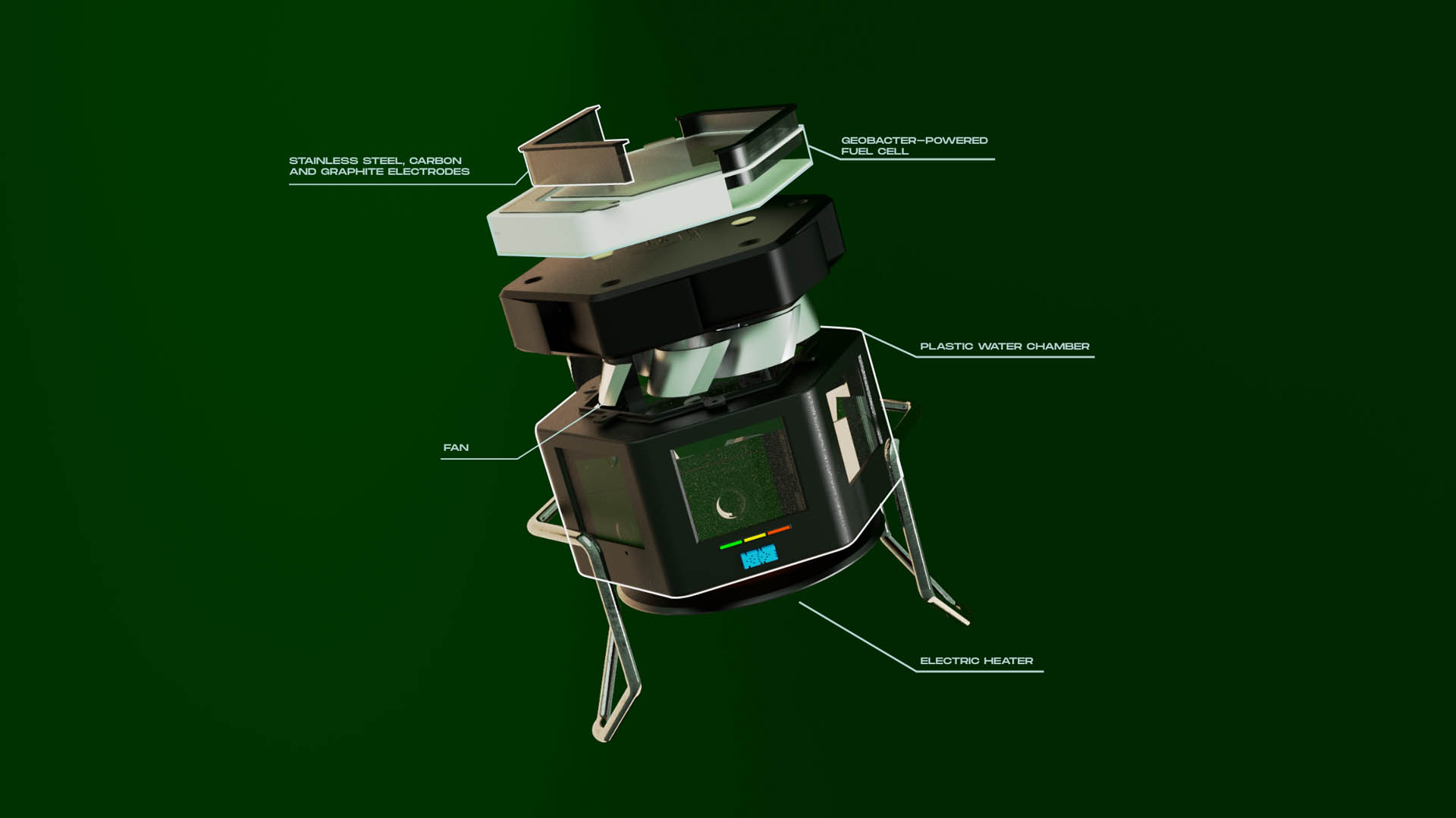 The aforementioned process occurs inside something we’ve called a biobattery: these batteries are designed so that they can be stacked on top of each other and wired in series to supply enough power to an electrical stove and a humidity and temperature sensor. These Bio-batteries use a special bacteria called geobacter to create energy. Geobacter is capable of transforming internally chemical energy from the respiration of metals into electrical energy, transferring the electrons derived from the oxidation of compounds. Geonergy’s fuel cell is powered by organic matter that generates energy due to electrons passing through an anode and a cathode. Each of these fuel cells can last up to 9 months.