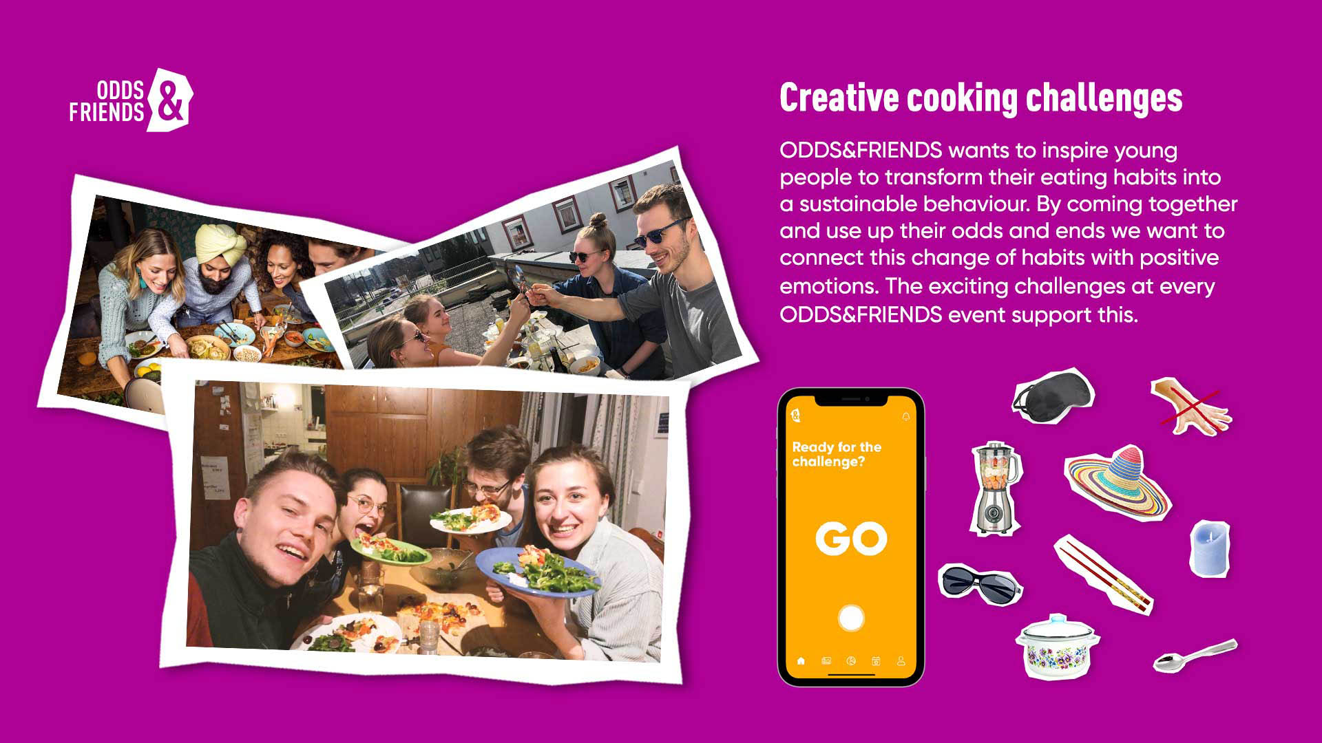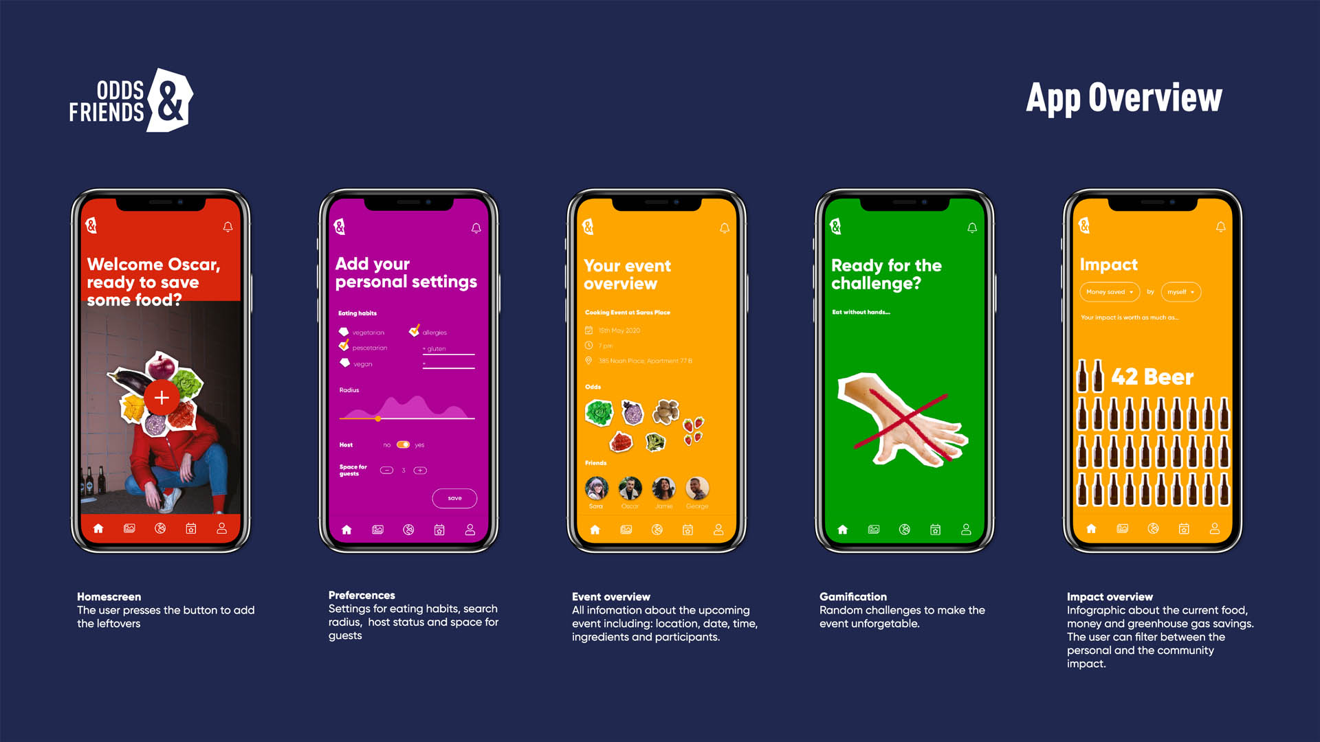ODDS&FRIENDS, an app where young people enter their food leftovers and meet up for cooking. You add your leftover food via a photo mechanism to the app. Every Thursday, depending on the food you have previously entered, you will be thrown together to meet up and cook together your leftovers with other people. By coming together and using up their odds and ends we want to connect this change of habits with positive emotions. The exciting challenges like e.g. eating without hands at every ODDS&FRIENDS event support this.