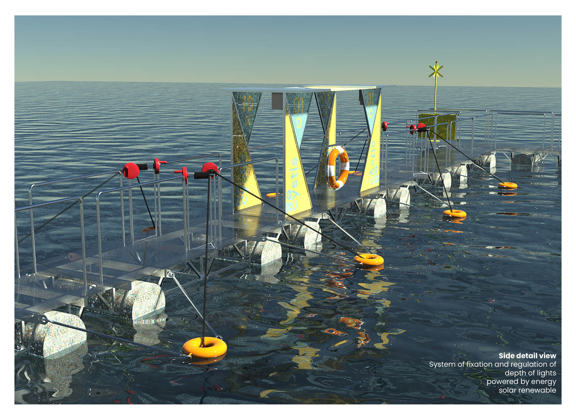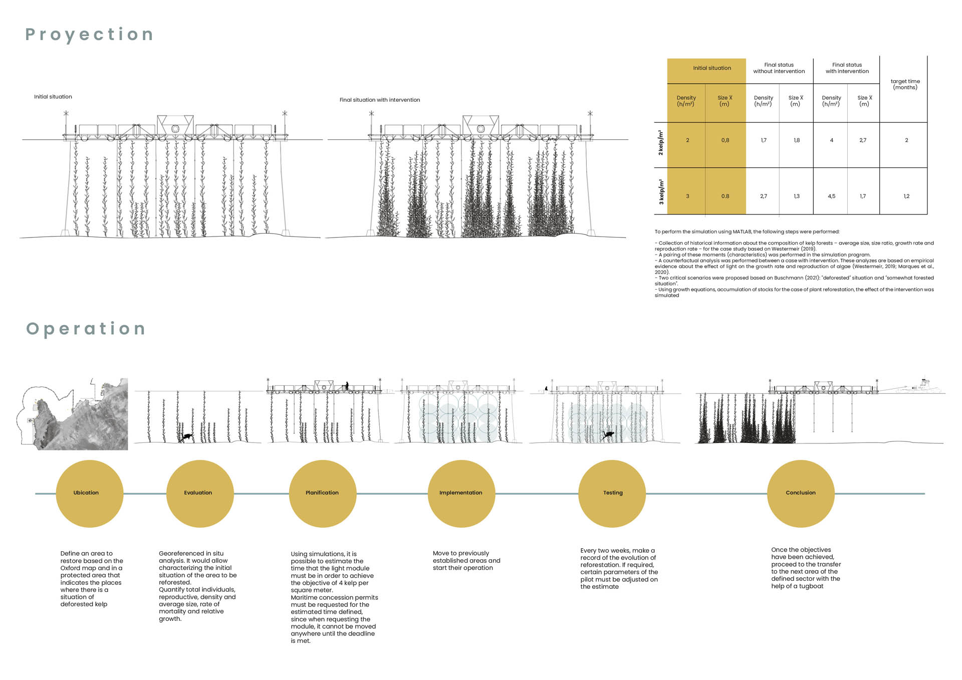The research and development of “Recystis” was based on quantitative methods – scientific articles, data, and interviews with marines and biologists – to analyze the role of the light in their reforestation and regeneration process, as well as qualitative and structural aspects for the structure of the module. The results of this research – based on quantitative simulations – show that through “Recystis” is possible to duplicate the rate of growth and reproduction of kelp forest, reforesting them in a period between 3 to 8 weeks of application (depending on their initial state).