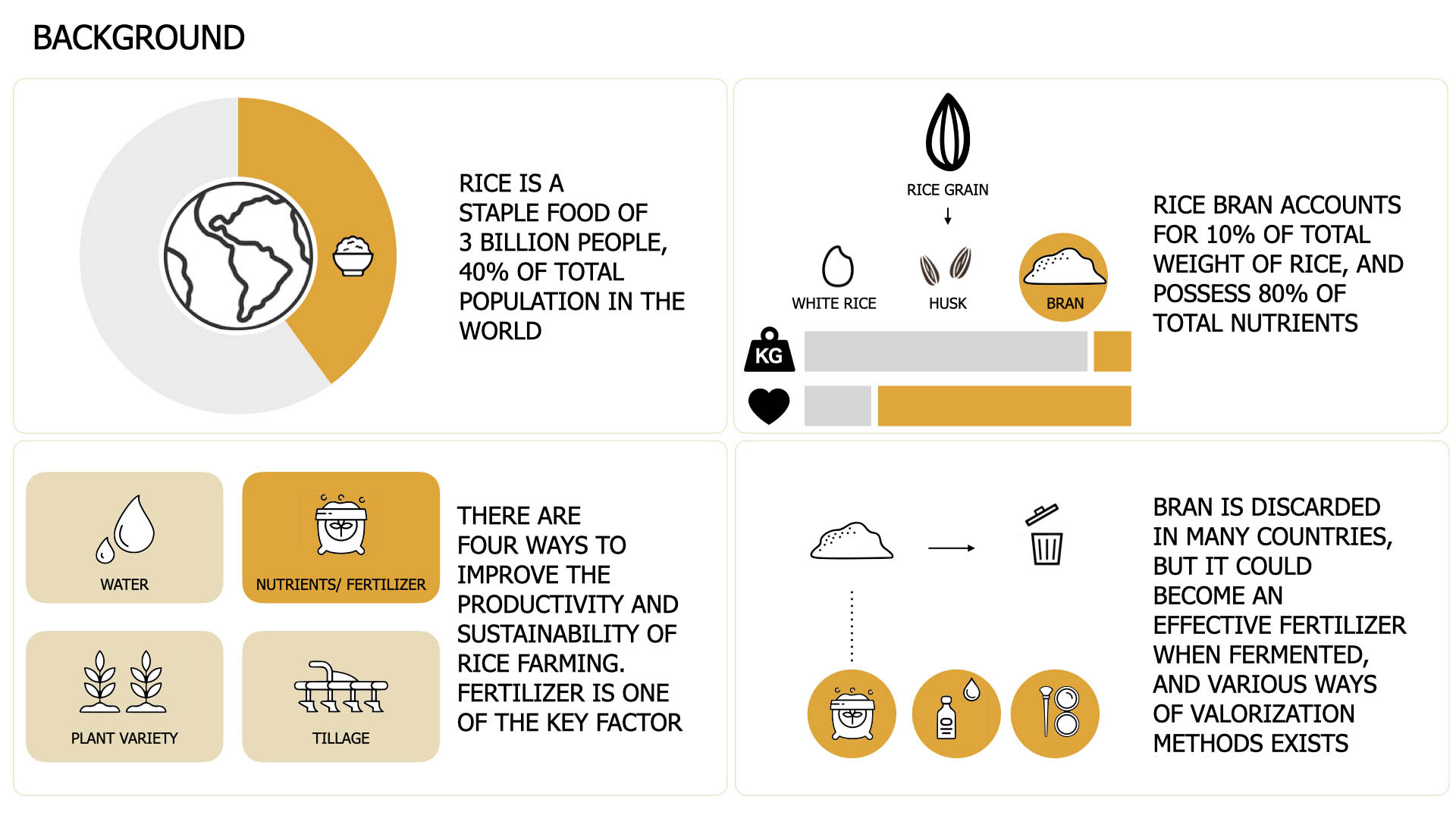 In Japan, this rice bran has been used for various purposes. For example, rice bran is a rich source of nutrients and can be converted into a very good fertilizer by fermentation, because it increases the bacteria and fungus in the soil when used. Various studies have shown that productivity can be increased by using fermented rice bran as a fertilizer in rice cultivation. In addition to fertilizers, rice bran can be converted into fermented foods, cosmetics, oil, and other products that generate a variety of economic value, and thus present a great opportunity.
