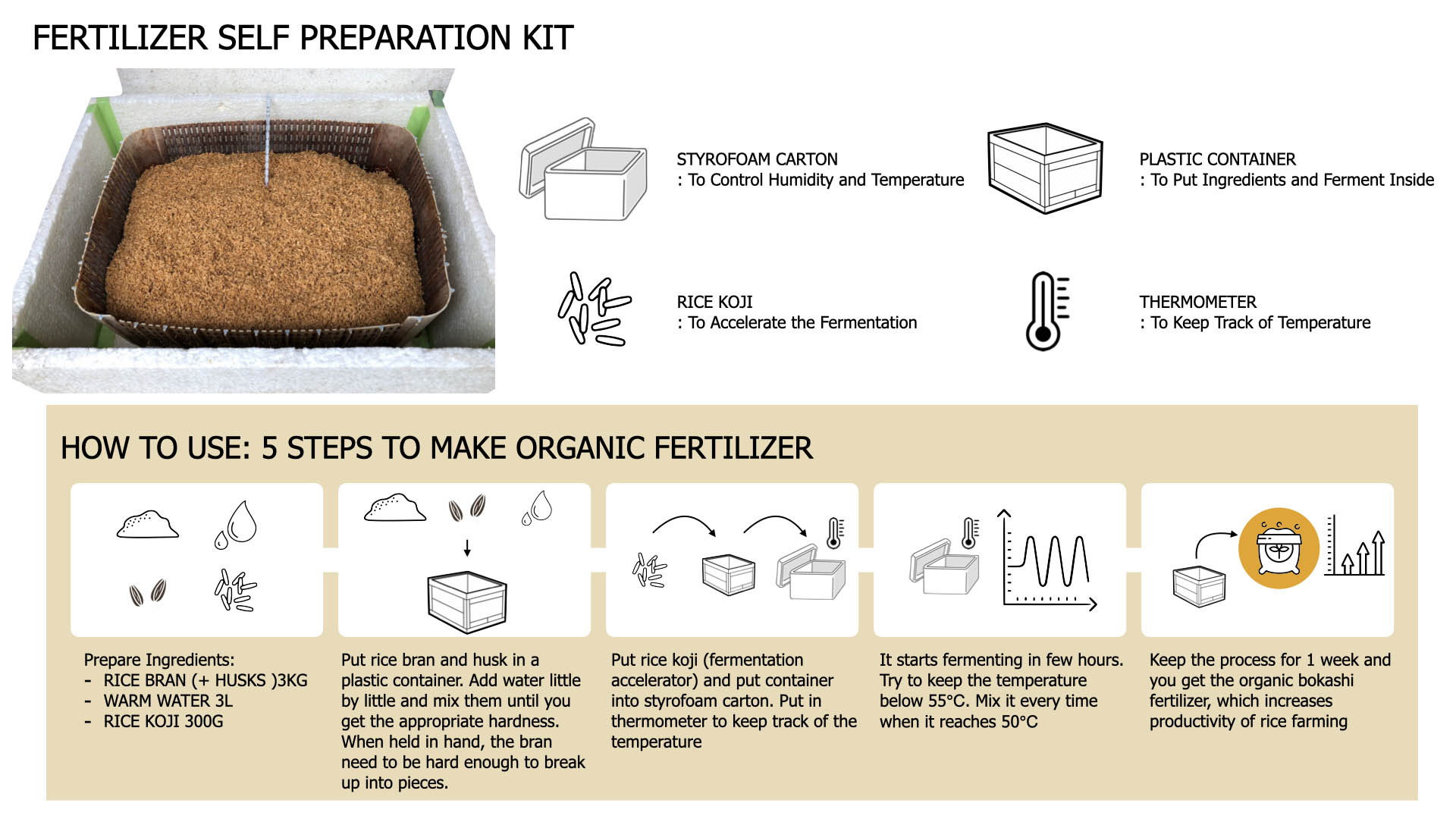 3. Use the funds obtained from the above and the rice koji to create fermentation kits for converting rice bran into fertilizer, and distribute them to farmers in developing countries.