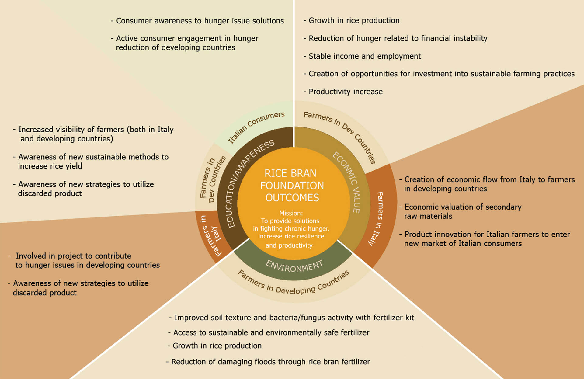 The Rice Bran Foundation is a program that creates economic value from rice bran that would otherwise be discarded in Italy and converts the proceeds into fertilizer making kits that can be used in developing countries for distribution.