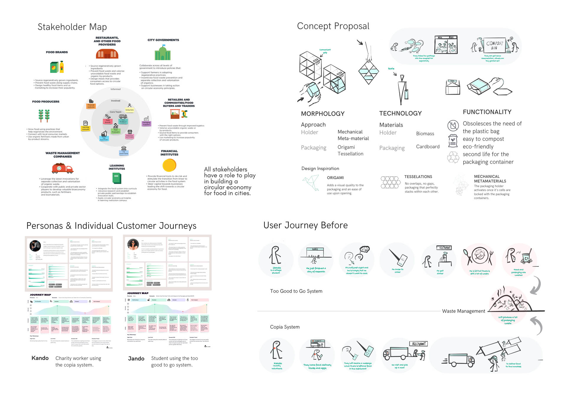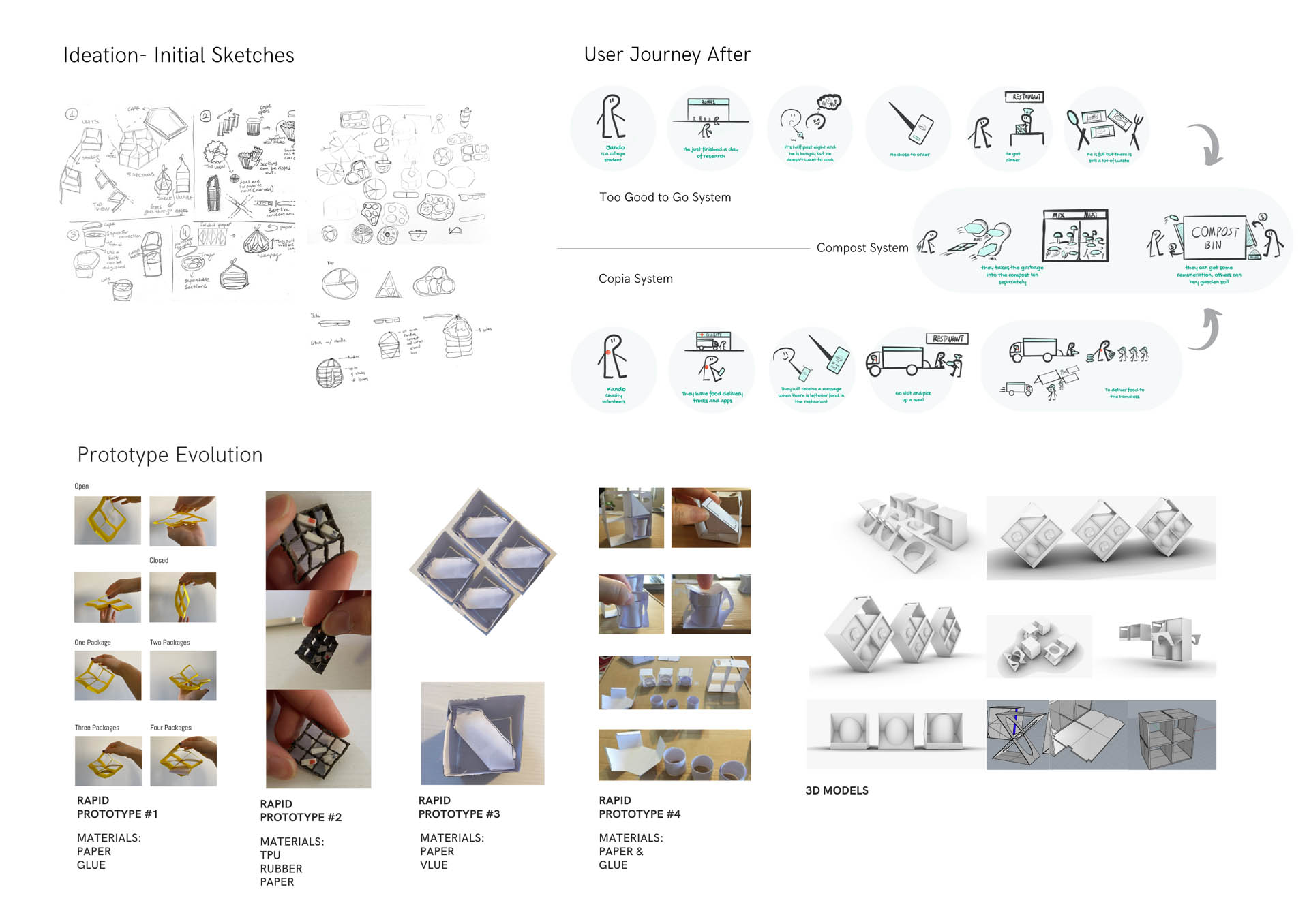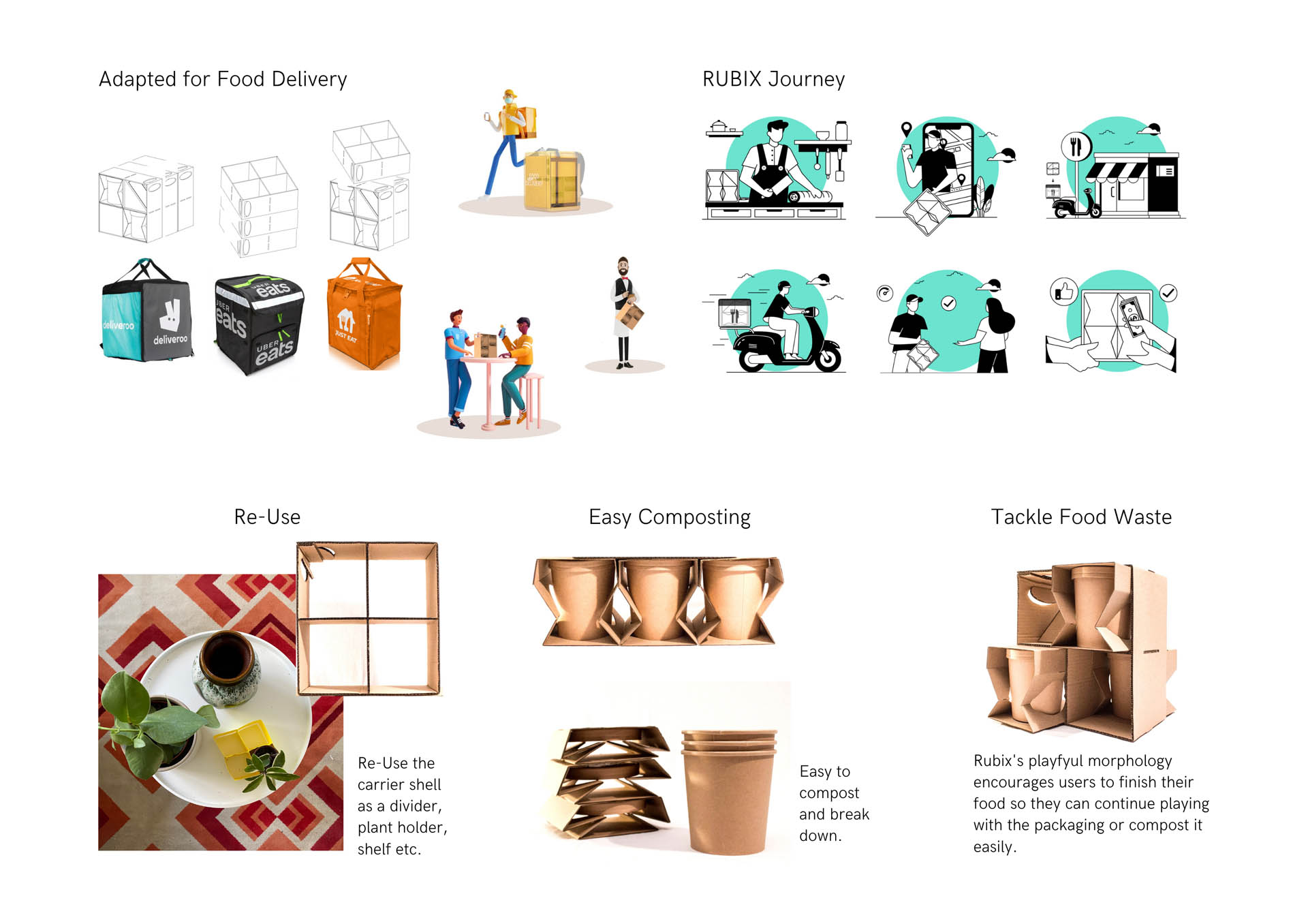 Our research process include the following service design tools: rigorous benchmarking of case studies in the following sectors: service design, packaging and systemic design, creating an eco-system map of those case studies, researching food waste systems and food packaging systems. We interviewed food delivery couriers, restaurant owners, users who order delivery and using our quantitative and qualitative research to create RUBIX.