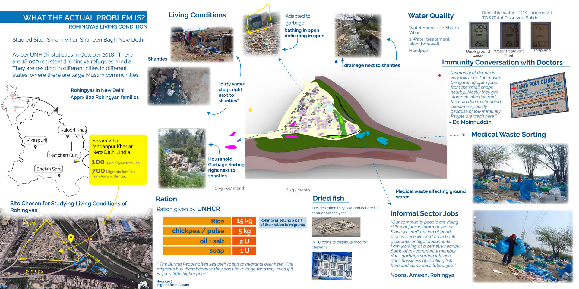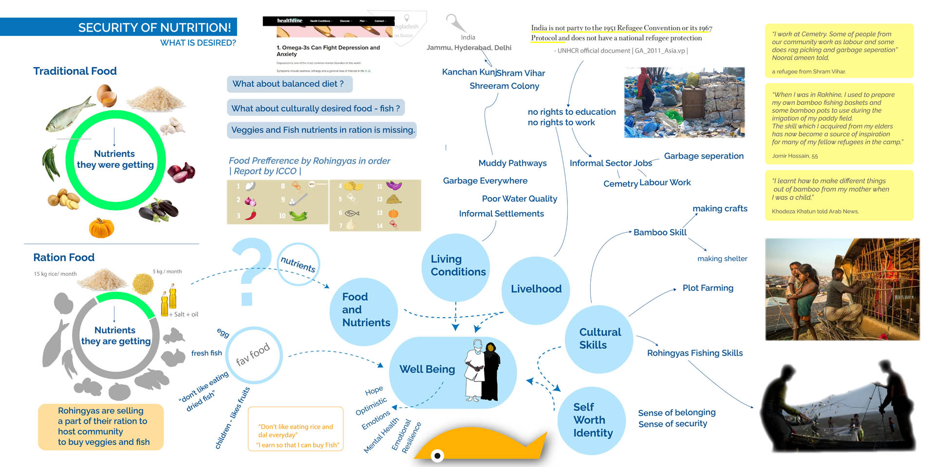Through intensive visits across weekends and interviews with residents, local doctors, aid workers etc, we were able to determine the complex system of receiving insufficient dry ration. The gross miscalculation of nutrients and no consideration for the traditional native palette of the community was made apparent. The community supplemented the need for fish and greens in their diet by selling the already sparse ration provided.