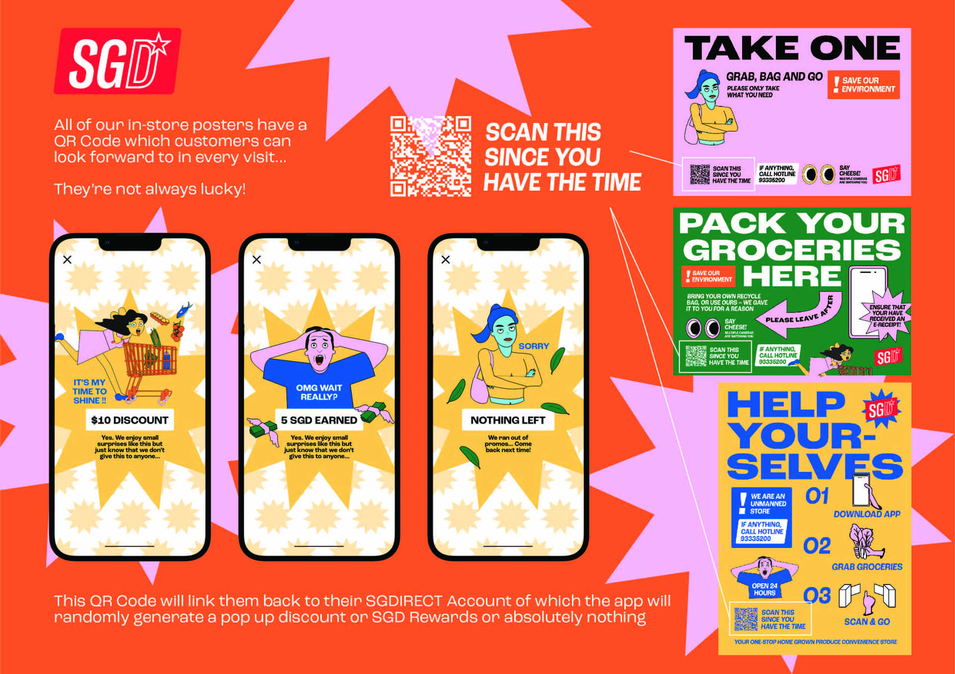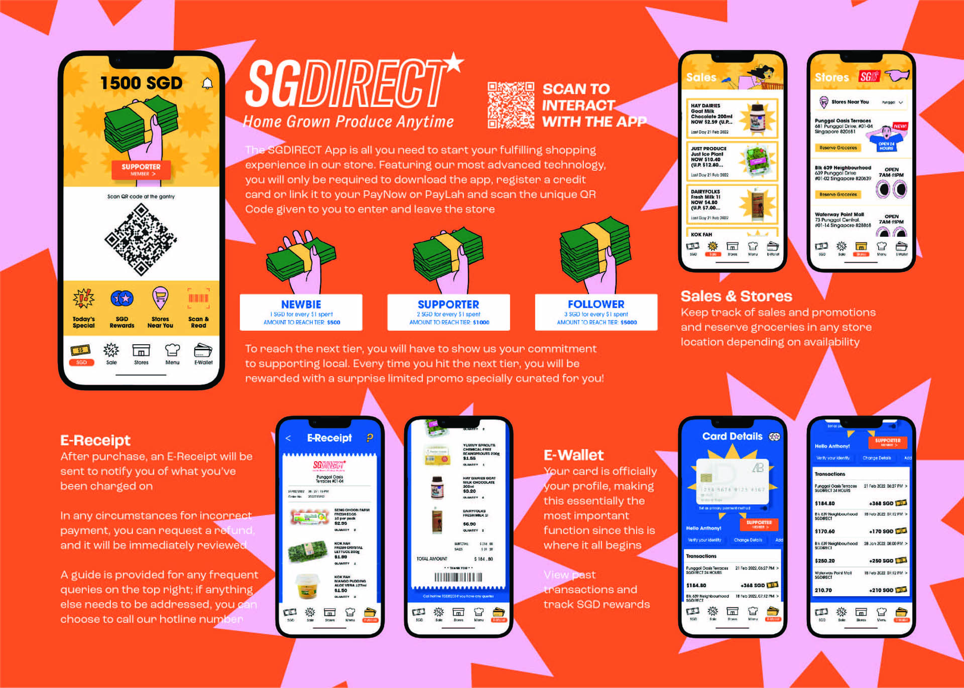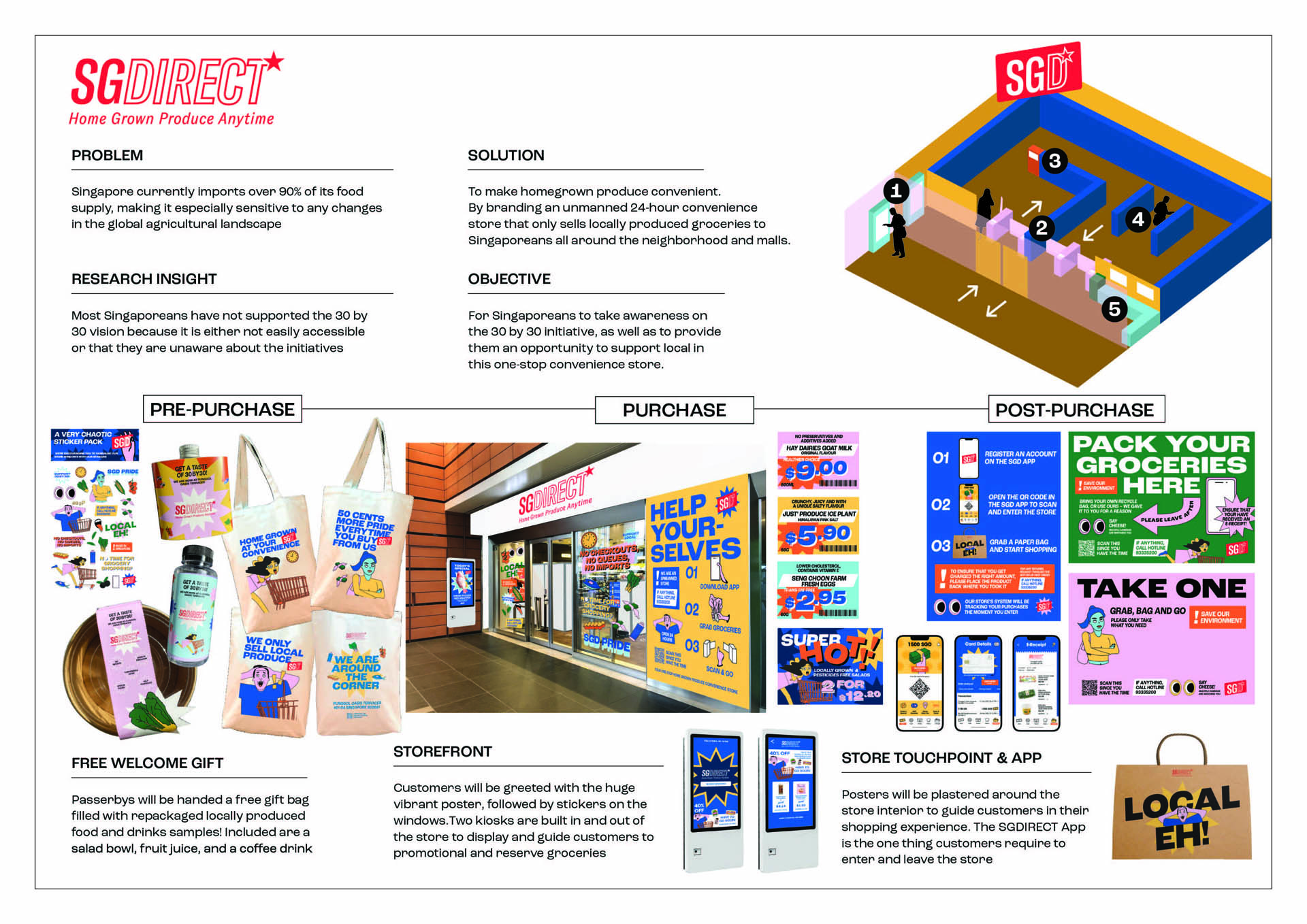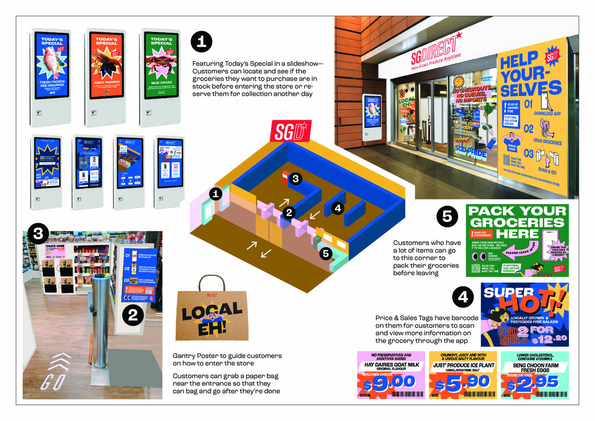 Ultimately, the research has concluded that Singaporeans have yet to support local produce because it is either not easily accessible or that they are unaware of the current initiatives. This project aims to target Singaporean Working Adults to take awareness of the 30 by 30 goal and provide them an opportunity to support Singapore’s local farms through this one-stop solution. SGDIRECT’s advanced technology only requires consumers to download the app that contains a unique QR code to enter and leave the store. After registering a credit card or linking it to DBS PayNow or PayLah, consumers can now grab, bag, and go without the need to checkout. The store can track every customer’s purchases by detecting what they take out from the racks until they scan out of the store. We house all sorts of groceries, from snacks to raw food primarily made in Singapore, assuring our promise of no imports.