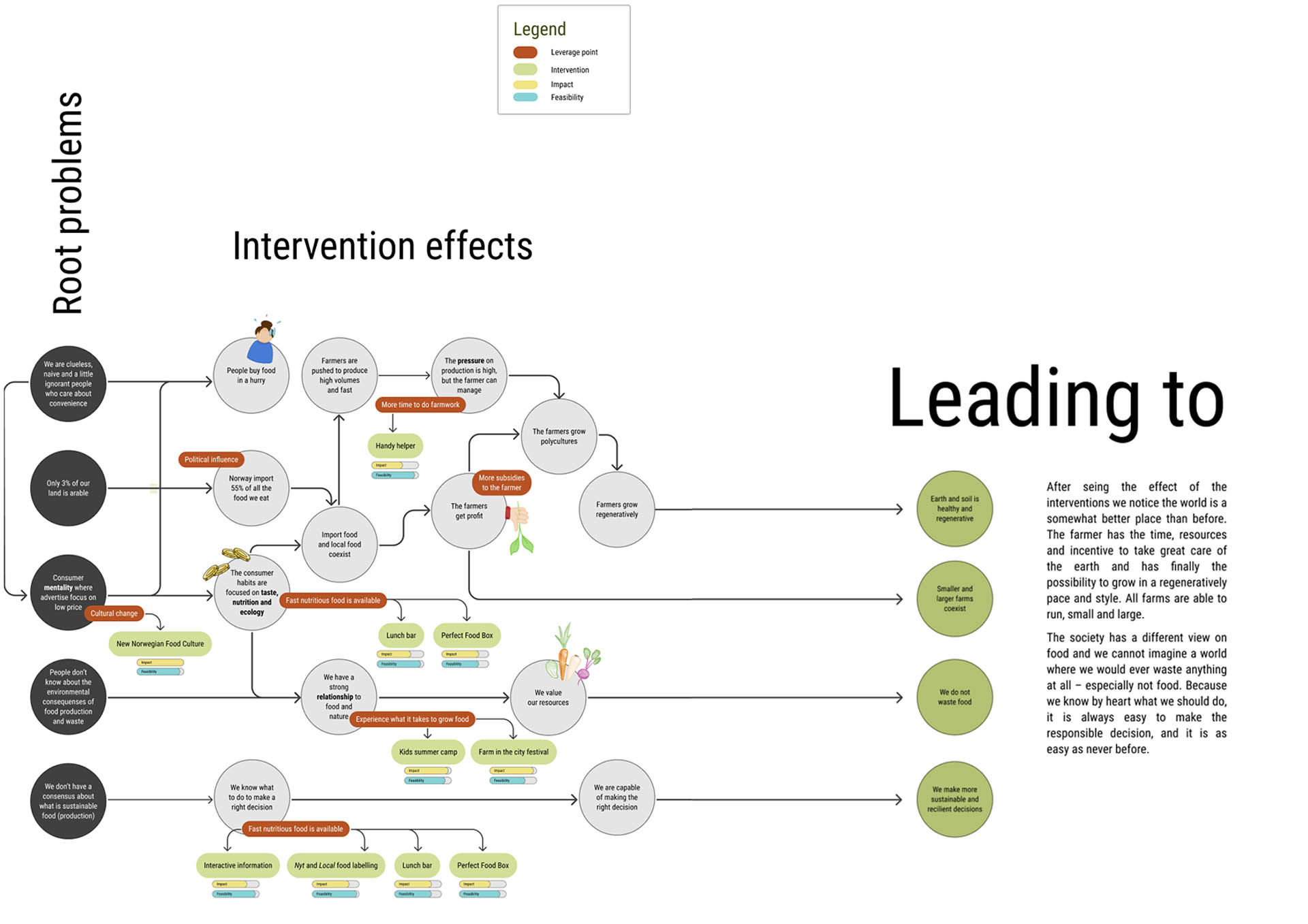 With this task we used system oriented design thinking, as our method to map out the supply chain in 2022 and how our future would look like in 2042. When we look at the whole system of symptoms, root problems, where they come from and what they lead to, we find these to be the main leverage points. These will be where we predict the most impact after a relatively small intervention.