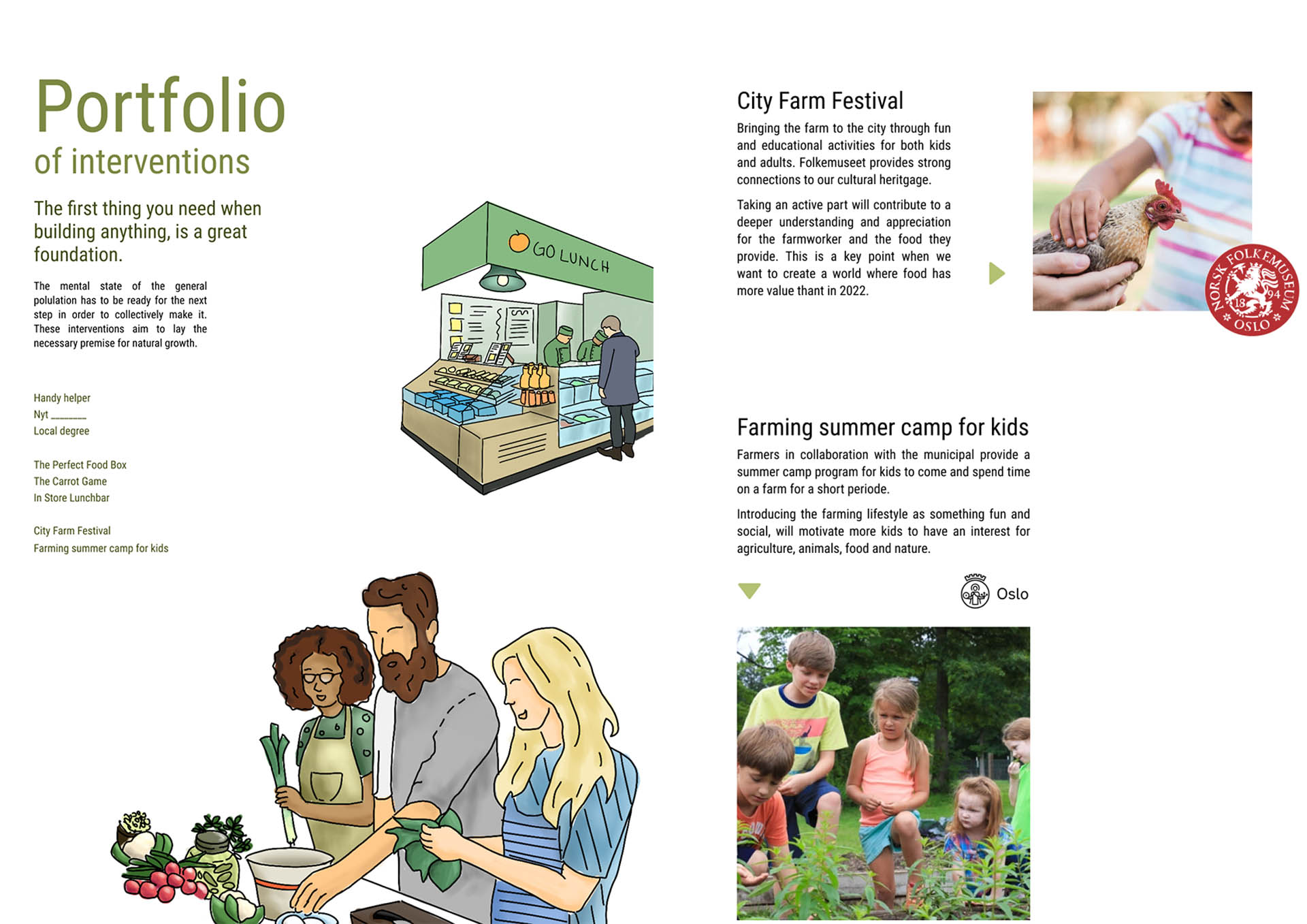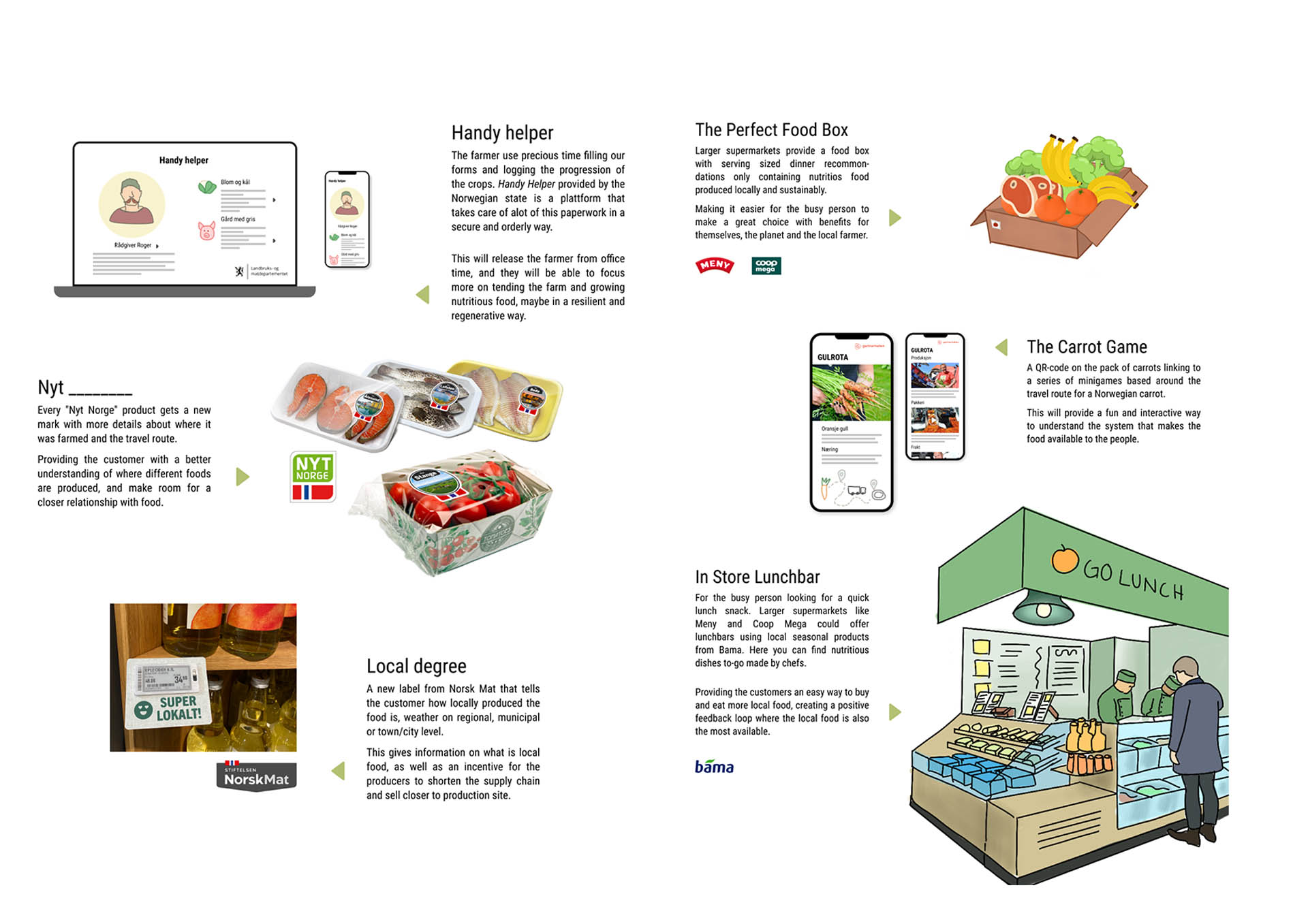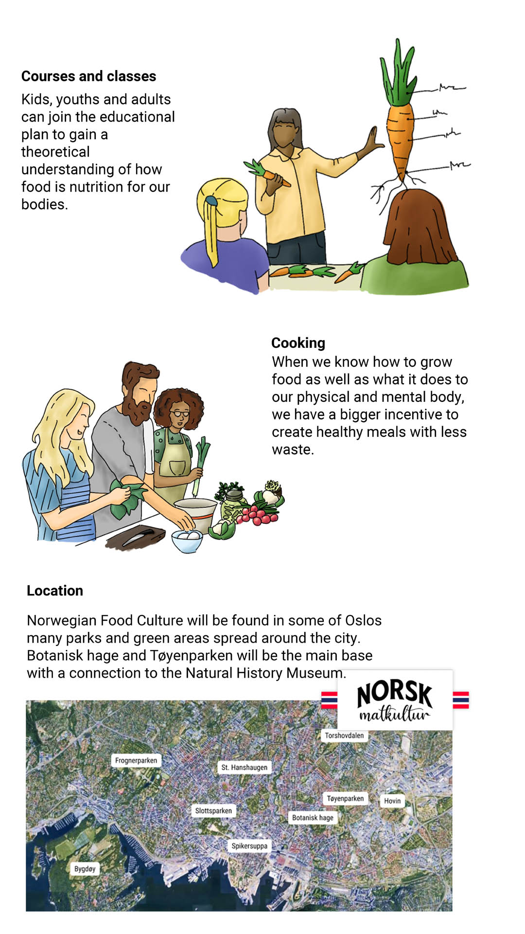By mapping out our current situation and where it would lead us to, we saw potentials for a desirable future.Our desirable future is The New Norwegian Food culture. It’s a place where you can be social, learn about and practice different agricultural and cooking traditions, as well as share your personal and cultural relationship to food. It is a place for the curious and enthusiastic, the scientists or the chefs, beginners or masters. This solution will give us a bigger perspective and value our resources more.